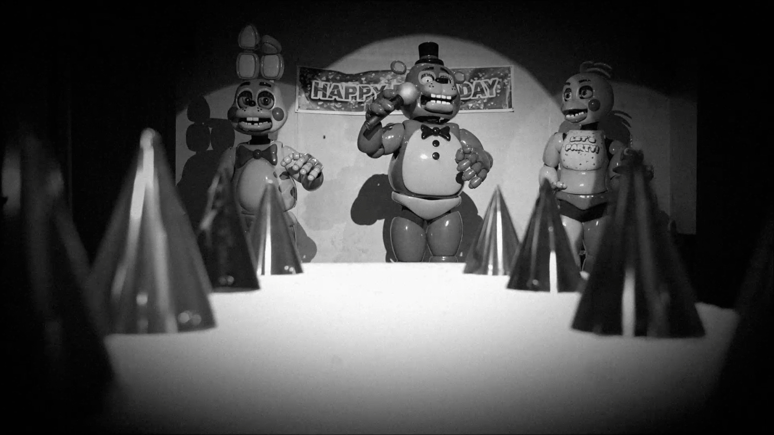We built a life-sized set full of real animatronic characters and filmed it.